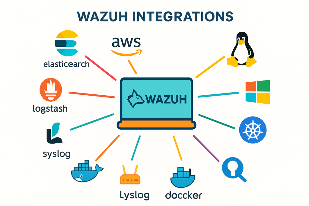 Additionally, Wazuh supports a wide range of integrations across major network services, cloud platforms, security tools, and threat intelligence feeds, making it highly adaptable to diverse IT environments.